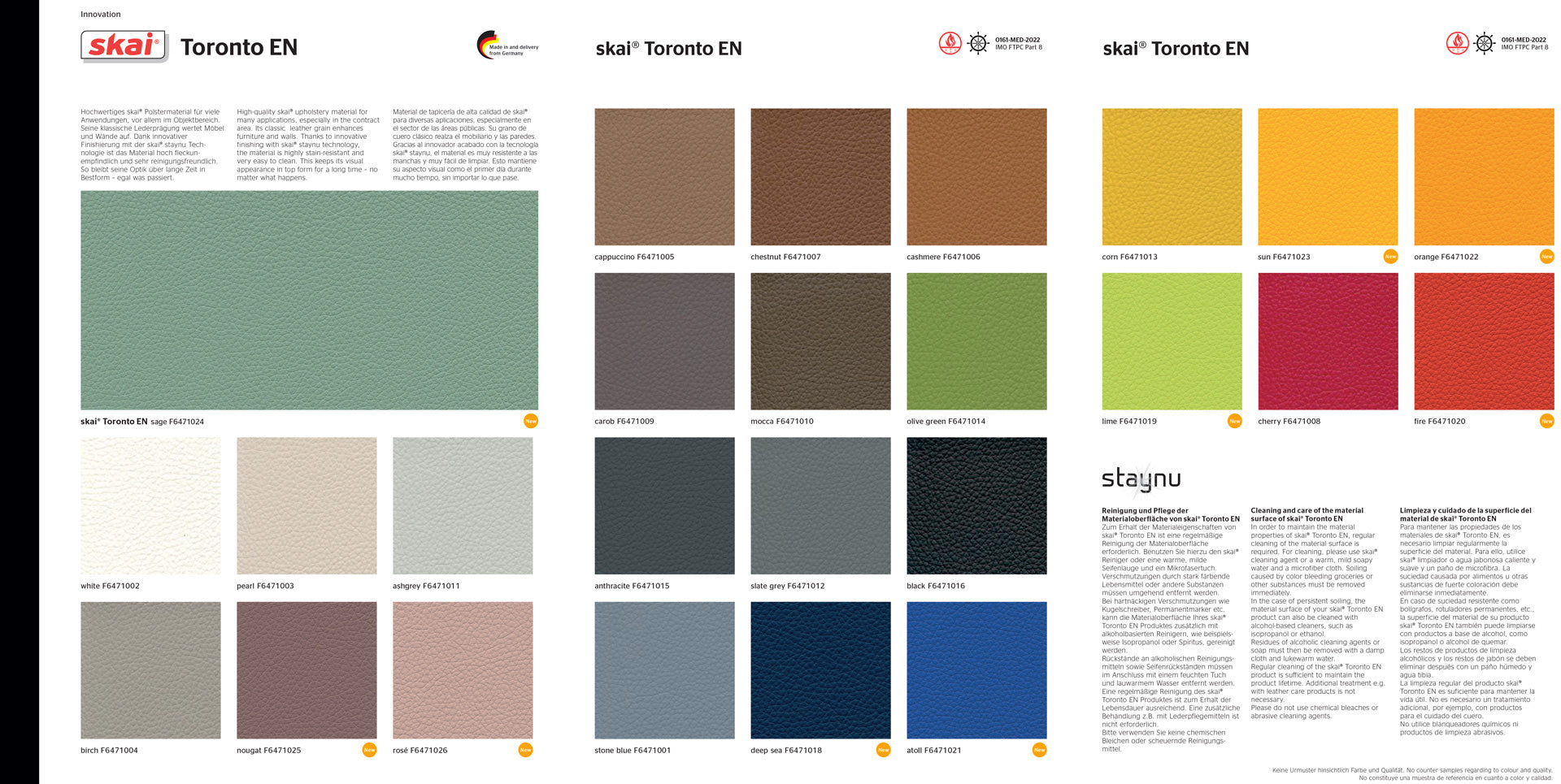 Oferujemy możliwość zamówienia bezpłatnego wzornika tkaniny Toronto Skai® od Continental, aby ułatwić podjęcie świadomej decyzji kolorystycznej.